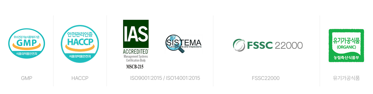 국내외 인증기관에서 인정받은 식품안전품질경영관리 시스템을 통해, 안전이 검증된 최고품질의 제품을 생산합니다.